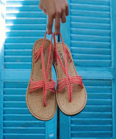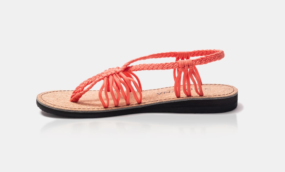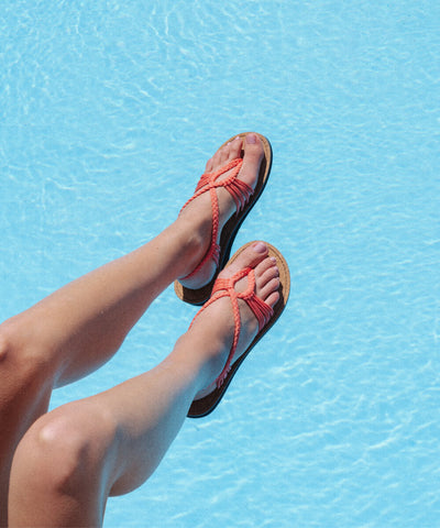 デリケートでフェミニンな雰囲気をたたえるサーモンピンクのサンダルはいかが?夏らしいスタイルに爽やかさとユニークなデザインをプラス。