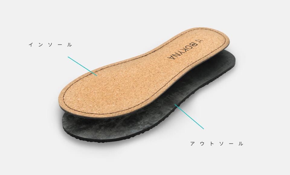 コルクの細胞構造ならではの弾力性で、足にかかる衝撃を吸収。断熱性にも優れているので、熱い地面も安心して歩けます。